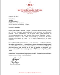 Nos es grato dirigirle la presente, luego de la conclusión del XIV Congreso Nacional del PCV, para expresarle nuestra felicitación por su reelección como Secretario General, a la vez congratulamos junto a ustedes, por el exitoso desarrollo del Congreso sustentado en el lema “Unidad – Democracia – Disciplina – Avance – Desarrollo” pilares que sin dudas fundamentarán y fortalecerán el devenir institucional del Partido, del Estado y de la Patria en favor del futuro del pueblo vietnamita.