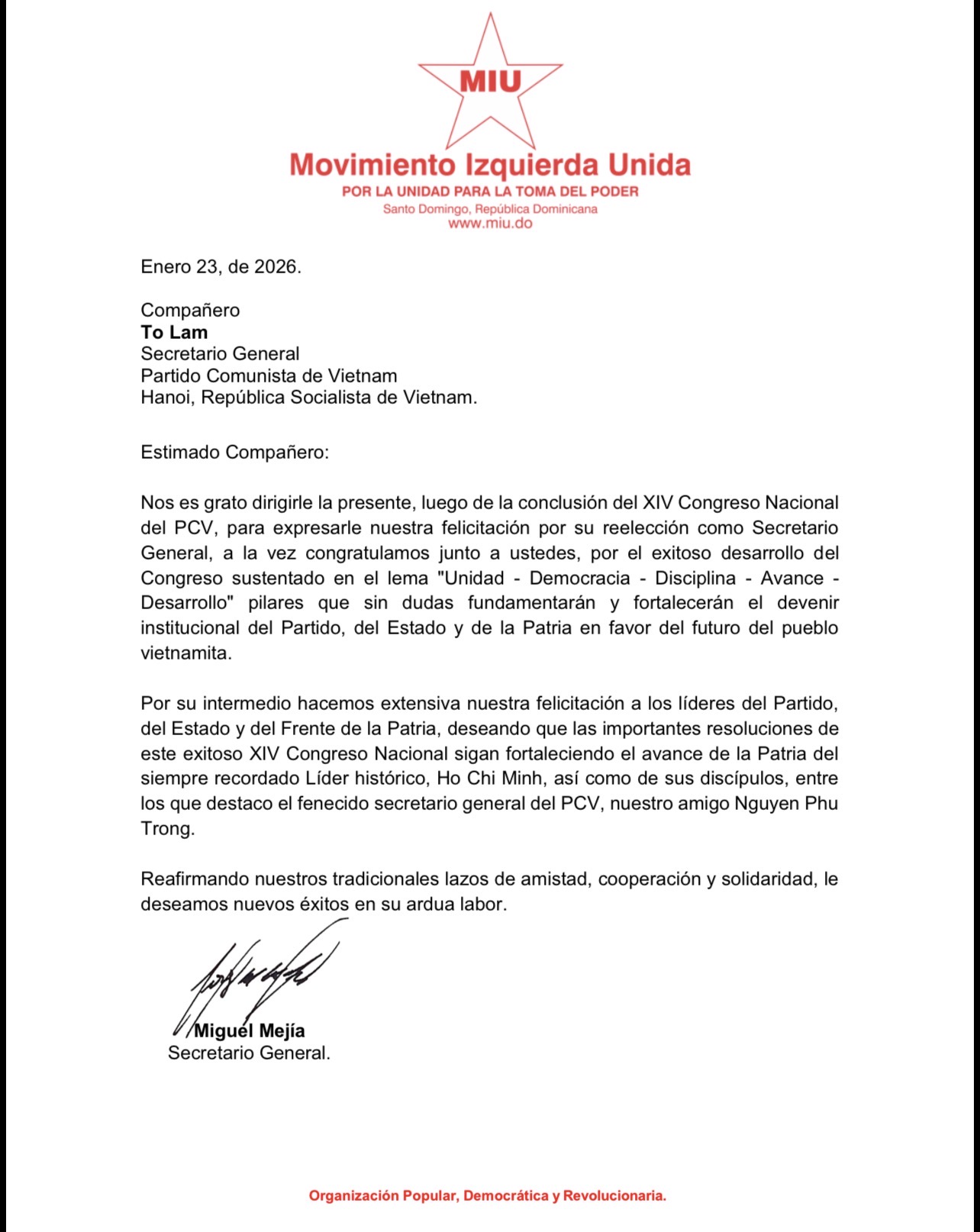 Nos es grato dirigirle la presente, luego de la conclusión del XIV Congreso Nacional del PCV, para expresarle nuestra felicitación por su reelección como Secretario General, a la vez congratulamos junto a ustedes, por el exitoso desarrollo del Congreso sustentado en el lema “Unidad – Democracia – Disciplina – Avance – Desarrollo” pilares que sin dudas fundamentarán y fortalecerán el devenir institucional del Partido, del Estado y de la Patria en favor del futuro del pueblo vietnamita.
