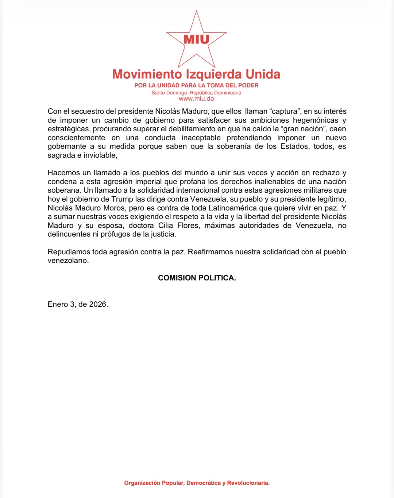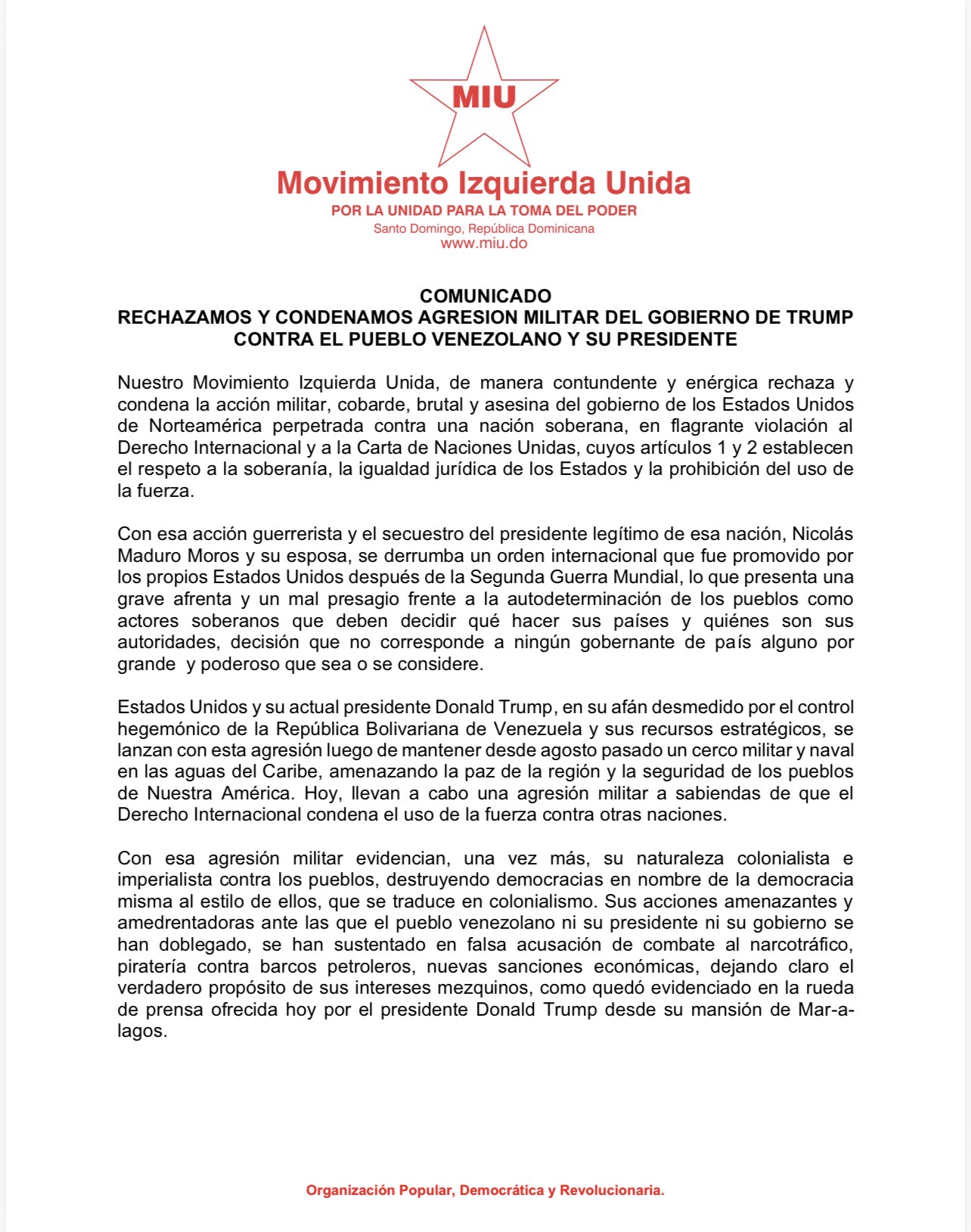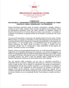 Nuestro Movimiento Izquierda Unida, de manera contundente y enérgica rechaza y condena la acción militar, cobarde, brutal y asesina del gobierno de los Estados Unidos de Norteamérica perpetrada contra una nación soberana, en flagrante violación al Derecho Internacional y a la Carta de Naciones Unidas, cuyos artículos 1 y 2 establecen el respeto a la soberanía, la igualdad jurídica de los Estados y la prohibición del uso de la fuerza.