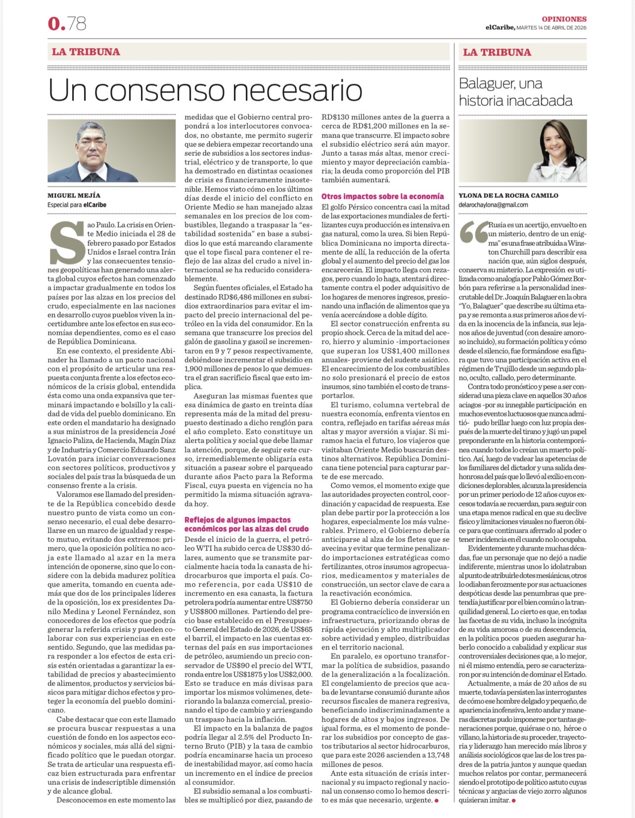Valoramos ese llamado del presidente de la República concebido desde nuestro punto de vista como un consenso necesario, el cual debe desarrollarse en un marco de igualdad y respeto mutuo, evitando dos extremos: primero, que la oposición política no acoja este llamado al azar en la mera intención de oponerse, sino que lo considere con la debida madurez política que amerita, tomando en cuenta además que dos de los principales líderes de la oposición, los ex presidentes Danilo Medina y Leonel Fernández, son conocedores de los efectos que podría generar la referida crisis y pueden colaborar con sus experiencias en este sentido. Segundo, que las medidas para responder a los efectos de esta crisis estén orientadas a garantizar la estabilidad de precios y abastecimiento de alimentos, productos y servicios básicos para mitigar dichos efectos y proteger la economía del pueblo dominicano.